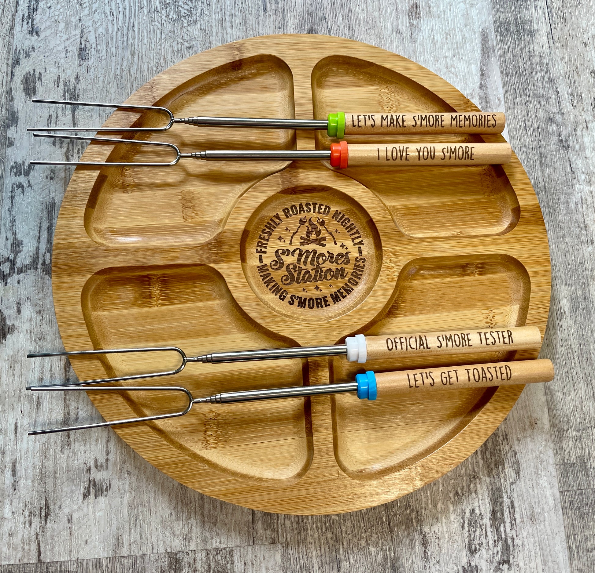 - Wooden handles engraved with S’mores-themed sayings
